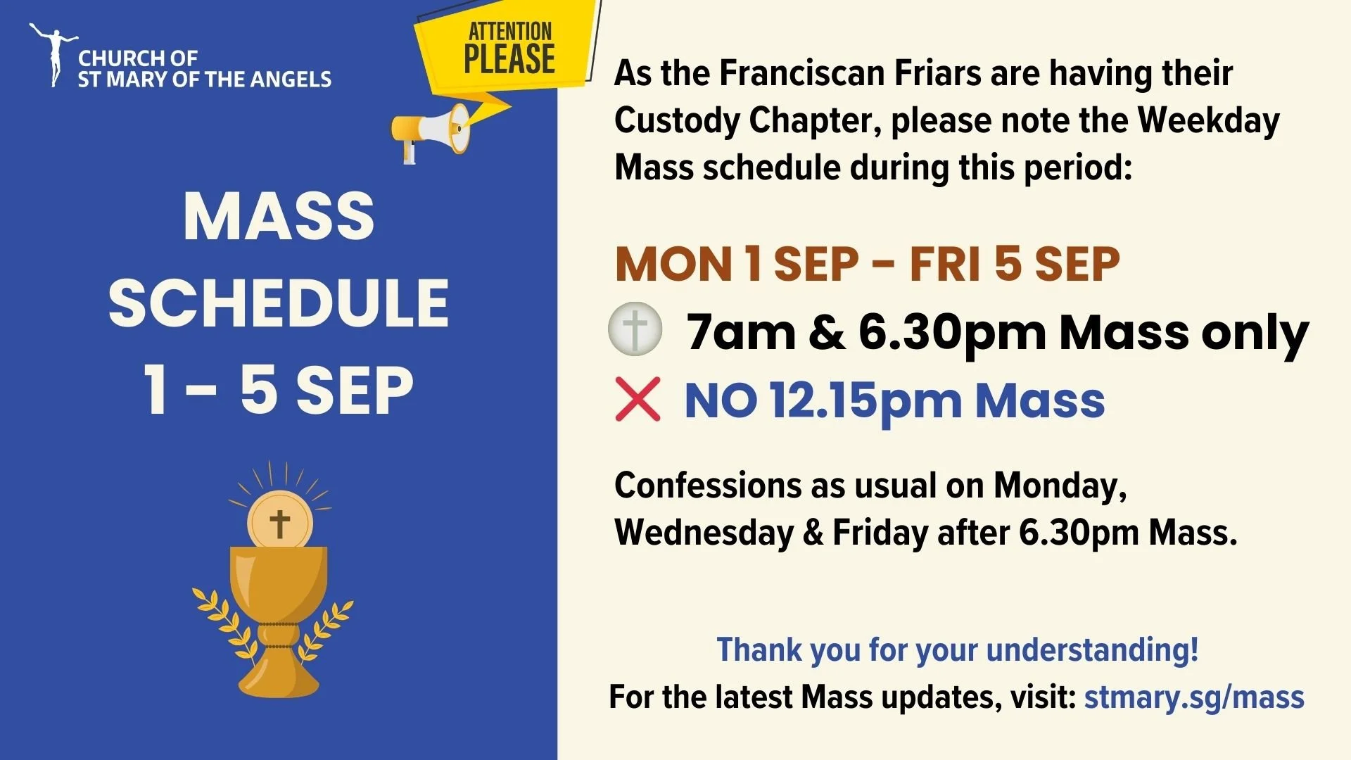 As the Franciscan Friars are having their Custody Chapter, please note that weekday Masses will be at 7am & 6.30pm only. The 12.15pm lunch time mass is cancelled during this period. Confessions as usual on Mon, Wed & Fri after the 6.30pm mass.