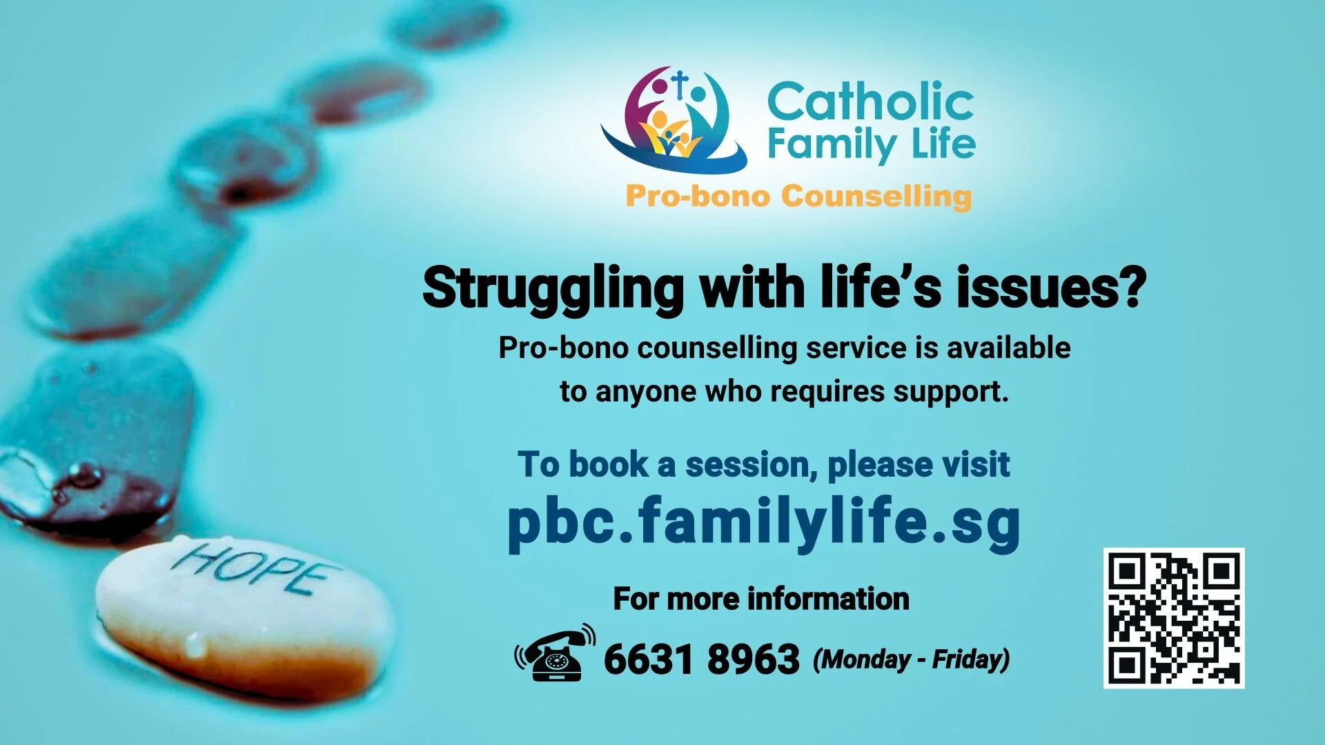 Catholic Family Life is providing pro-bono counselling services to anyone who requires support. If you or your family members are experiencing challenges and could benefit from professional guidance, our counsellors are here to help.