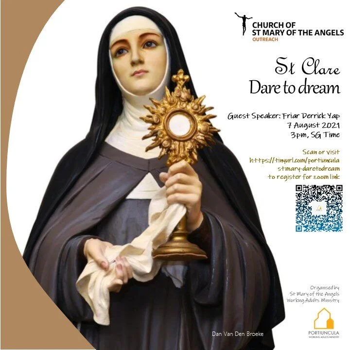 Aug 7 Portiuncula St Clare - Dare to Dream Saturday 7 August 2021 15:00 16:30 Google Calendar ICS Guest Speaker: Friar Derrick Yap View Event →