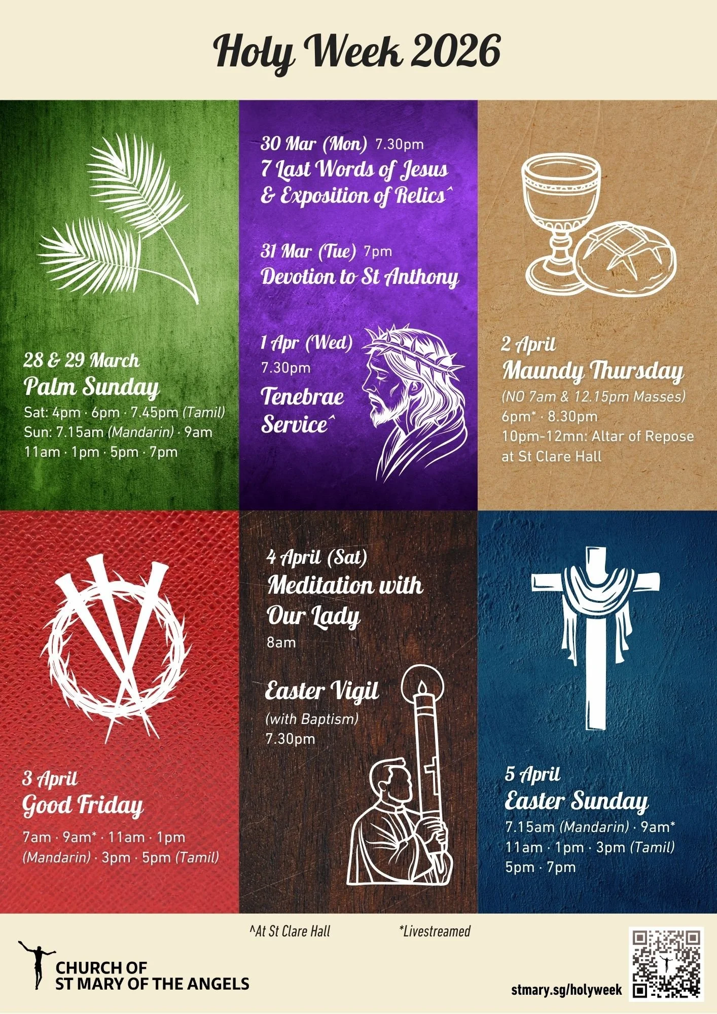 All Services will be held at the Main Church except for Prayer service (The 7 Last Words of Jesus) on Monday 30 Mar, and the Tenebrae Service on Wed 1 Apr, which will be held in St Clare Hall.