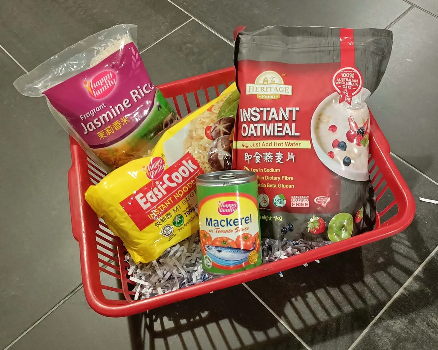 A gift of home groceries (a packet of instant noodles and instant oatmeal, 1kg of rice and a can of mackerel) (see accompanying photo)